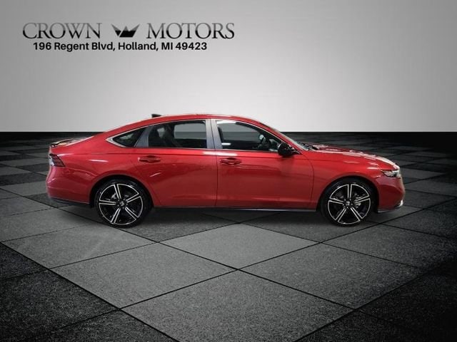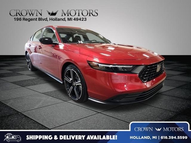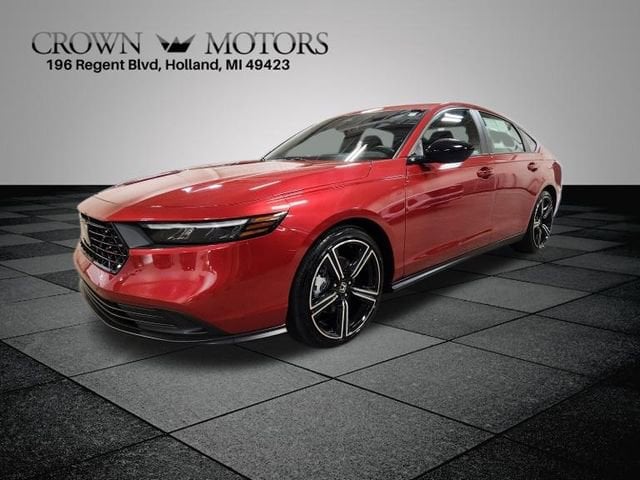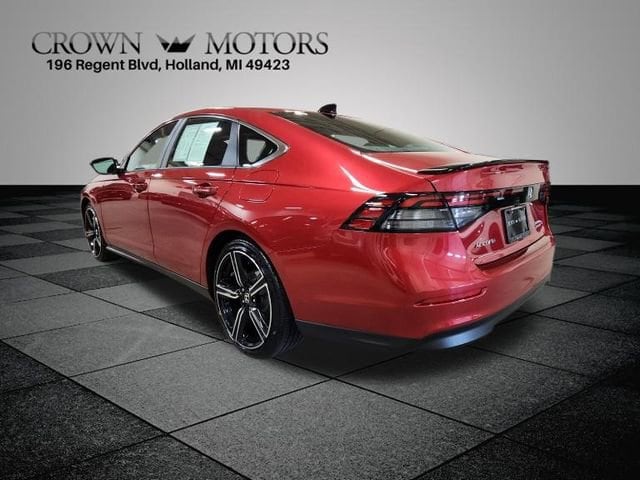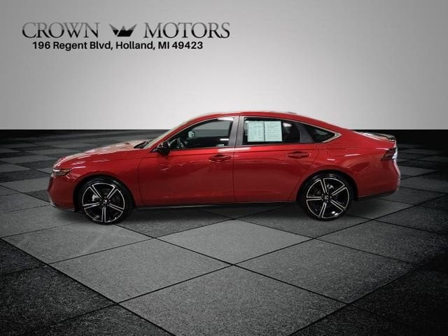 CARFAX One-Owner. Clean CARFAX. Certified. Red 2023 Honda Accord Hybrid Sport FWD eCVT 2.0L 16V DOHC **ONE OWNER**, **HONDA CERTIFIED**, **ACCIDENT FREE**, **LOCAL TRADE IN**, HondaTrue Certified Certified, 2.0L 16V DOHC, 4-Wheel Disc Brakes, 8 Speakers, ABS brakes, Adaptive Cruise Control: Adaptive Cruise Control (ACC) with Low-Speed Follow, Air Conditioning, Alloy wheels, AM/FM radio, Apple CarPlay/Android Auto, Auto High-beam Headlights, Automatic temperature control, Brake assist, Bumpers: body-color, Compass, Delay-off headlights, Driver door bin, Driver vanity mirror, Dual front impact airbags, Dual front side impact airbags, Electronic Stability Control, Emergency communication system: HondaLink, Exterior Parking Camera Rear, Fabric Seat Trim, Four wheel independent suspension, Front anti-roll bar, Front Bucket Seats, Front Center Armrest, Front dual zone A/C, Front reading lights, Fully automatic headlights, Illuminated entry, Knee airbag, Lane departure: Lane Keeping Assist System (LKAS) active, Leather Shift Knob, Leather steering wheel, Low tire pressure warning, Occupant sensing airbag, Outside temperature display, Overhead airbag, Overhead console, Panic alarm, Passenger door bin, Passenger vanity mirror, Power door mirrors, Power driver seat, Power moonroof, Power steering, Power windows, Radio data system, Radio: 180-Watt Audio System, Rear anti-roll bar, Rear reading lights, Rear seat center armrest, Rear side impact airbag, Rear window defroster, Remote keyless entry, Security system, Speed control, Speed-sensing steering, Speed-Sensitive Wipers, Split folding rear seat, Spoiler, Steering wheel mounted audio controls, Telescoping steering wheel, Tilt steering wheel, Traction control, Trip computer, Variably intermittent wipers, Wheels: 19" x 8.5J Berlina Black, 2.0L 16V DOHC.
