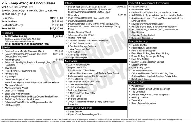 2025 Jeep Wrangler Sahara Granite Crystal Metallic Clearcoat 110 MPH Vehicle Max Speed Calibration, 3.45 Overall Top Gear Ratio, 4-Wheel Disc Brakes, 4G LTE Wi-Fi Hot Spot, 8 Speakers, ABS brakes, Air Conditioning, Alloy wheels, AM/FM radio: SiriusXM, Apple CarPlay, Apple CarPlay/Android Auto, Auto High Beam Headlamp Control, Automatic temperature control, Aux Battery, Blind Spot & Cross Path Detection, Brake assist, Cloth Low-Back Bucket Seats, Compass, Connectivity - US/Canada, Delay-off headlights, Driver door bin, Driver vanity mirror, Dual front impact airbags, Dual front side impact airbags, Electronic Stability Control, Emergency communication system: Jeep Connect, Front anti-roll bar, Front Bucket Seats, Front Center Armrest w/Storage, Front dual zone A/C, Front fog lights, Front reading lights, Fully automatic headlights, Google Android Auto, Heated door mirrors, Heated front seats, Heated steering wheel, Heavy Duty Suspension w/Gas Shocks, Illuminated entry, Integrated roll-over protection, Low tire pressure warning, MOPAR All-Weather Floor Mats, Non-Lock Fuel Cap w/o Discriminator, Occupant sensing airbag, Outside temperature display, Overhead airbag, Panic alarm, ParkSense Rear Park Assist System, ParkView Rear Back-Up Camera, Passenger door bin, Passenger vanity mirror, Power door mirrors, Power steering, Power Top Quarter Window Storage Bag, Power windows, Quick Order Package 22G Sahara, Radio data system, Radio: Uconnect 5 w/12.3" Display, Rear anti-roll bar, Rear reading lights, Rear Window Defroster, Rear Window Wiper/Washer, Remote keyless entry, Removable Rear Quarter Windows, Safety Group, Security system, Side Steps, Sky 1-Touch Power Top, Speed control, Split folding rear seat, Steering wheel mounted audio controls, Stop-Start Dual Battery System, Tachometer, Telescoping steering wheel, Tilt steering wheel, Traction control, Trip computer, Variably intermittent wipers, Voltmeter, Wheels: 18" x 7.5" Machine/Painted Gray.