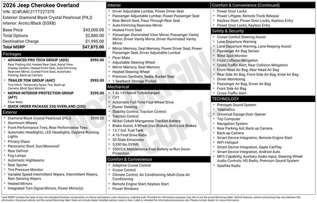 If you're seeking a capable, well-equipped, and stylish SUV that can handle all of life's adventures, the 2026 Jeep Cherokee Overland is an exceptional choice. Experience the power and refinement of this remarkable vehicle for yourself. We invite you to visit our showroom and take it for a test drive today. Price includes: $1000 - 2026 National Retail Bonus Cash