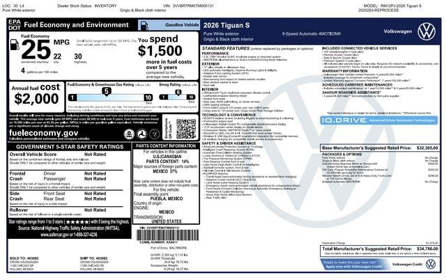 Price does not include tax, title, plate and dealer documentation. Price includes: $1000 - Customer Bonus. Exp. 02/02/2026 Please visit www.CROWNVOLKSWAGEN.com for more info, payment calculator, trade appraisal link, vehicle availability, and online purchasing tools. EVERY New Volkswagen comes with complimentary (FREE!) factory recommended service for the first TWO YEARS (or 20,000 miles), and many offer an additional year (or 30,000 miles), along with a 4 Year (or 50,000 mile) warranty!