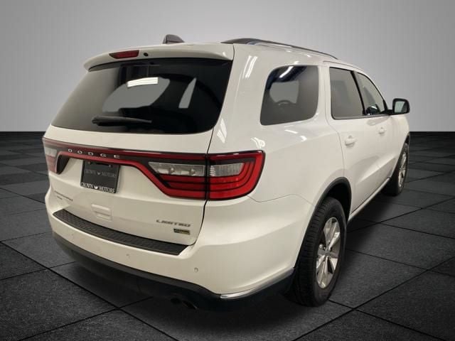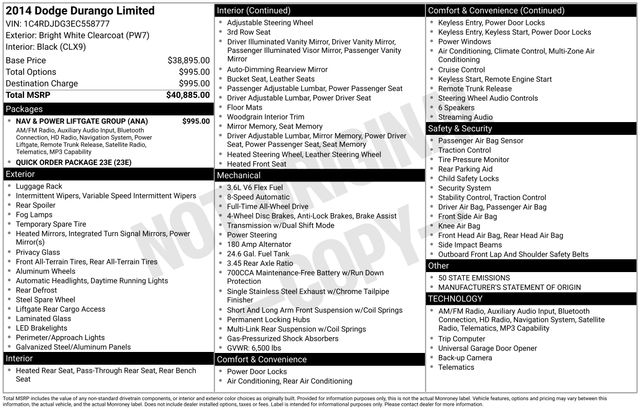 Bright White Clearcoat 2014 Dodge Durango Limited AWD 8-Speed Automatic 3.6L V6 Flex Fuel 24V VVT AWD, 1-Yr SIRIUSXM Travel Link Service, Nav & Power Liftgate Group, Power Liftgate, Quick Order Package 23E, Radio: Uconnect 8.4AN AM/FM/SXM/HD/BT/NAV, SIRIUSXM Traffic, SiriusXM Travel Link, 3.45 Rear Axle Ratio, 3rd row seats: split-bench, 4-Wheel Disc Brakes, 6 Speakers, ABS brakes, Air Conditioning, Alloy wheels, AM/FM radio: SiriusXM, Anti-whiplash front head restraints, Audio memory, Auto-dimming door mirrors, Auto-dimming Rear-View mirror, Automatic temperature control, Brake assist, Bumpers: body-color, Compass, Delay-off headlights, Driver door bin, Driver vanity mirror, Dual front impact airbags, Dual front side impact airbags, Electronic Stability Control, Emergency communication system: Uconnect Access, Exterior Parking Camera Rear, Four wheel independent suspension, Front anti-roll bar, Front Bucket Seats, Front Center Armrest w/Storage, Front dual zone A/C, Front fog lights, Front reading lights, Fully automatic headlights, Garage door transmitter, Heated door mirrors, Heated front seats, Heated rear seats, Heated steering wheel, Illuminated entry, Knee airbag, Leather Trimmed Bucket Seats, Low tire pressure warning, Manufacturer's Statement of Origin, Memory seat, Occupant sensing airbag, Outside temperature display, Overhead airbag, Overhead console, Panic alarm, Passenger door bin, Passenger vanity mirror, Power door mirrors, Power driver seat, Power passenger seat, Power steering, Power windows, Radio data system, Radio: Uconnect 8.4A AM/FM/SXM/BT, Rear air conditioning, Rear anti-roll bar, Rear Parking Sensors, Rear reading lights, Rear seat center armrest, Rear window defroster, Rear window wiper, Remote keyless entry, Roof rack, Security system, Speed control, Speed-Sensitive Wipers, Split folding rear seat, Spoiler, Steering wheel mounted audio controls, Tachometer, Telescoping steering wheel, Tilt steering wheel, Traction control, Trip computer, Turn signal indicator mirrors, Variably intermittent wipers, Wheels: 18 x 8.0 Polished Aluminum, AWD, 1-Yr SIRIUSXM Travel Link Service, Nav & Power Liftgate Group, Power Liftgate, Quick Order Package 23E, Radio: Uconnect 8.4AN AM/FM/SXM/HD/BT/NAV, SIRIUSXM Traffic, SiriusXM Travel Link.