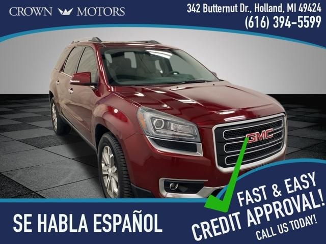 Clean CARFAX. Crimson Red 2015 GMC Acadia SLT-2 FWD 6-Speed Automatic 3.6L V6 SIDI **ACCIDENT FREE**, **LOCAL TRADE IN**, FWD, Light Titanium Leather, 10 Speakers, 19" x 7.5" Aluminum (4) Wheels, 2-Position Memory For Driver's Seat Adjuster, 3.16 Axle Ratio, 3rd row seats: split-bench, 4-Wheel Disc Brakes, 7-Passenger Seating (2-2-3 Seating Configuration), 8-Way Power Driver Seat, 8-Way Power Passenger Seat Adjuster, ABS brakes, Acoustical Insulation Package, Air Conditioning, Alloy wheels, AM/FM radio: SiriusXM, Auto-dimming door mirrors, Auto-dimming Rear-View mirror, Automatic temperature control, Body-Color Bodyside Moldings, Bodyside moldings, Bose Premium 10-Speaker Audio System, Brake assist, Bumpers: body-color, Carpeted Removable Front 2nd & 3rd Row Floor Mats, CD player, Compass, Delay-off headlights, Driver door bin, Driver vanity mirror, Dual front impact airbags, Dual front side impact airbags, Dual SkyScape 2-Panel Power Sunroof, Electronic Stability Control, Emergency communication system: OnStar Directions & Connections, Exterior Parking Camera Rear, Forward Collision Alert & Lane Departure Warning, Four wheel independent suspension, Front anti-roll bar, Front Bucket Seats, Front Center Armrest w/Storage, Front dual zone A/C, Front fog lights, Front License Plate Bracket, Front reading lights, Fully automatic headlights, Garage door transmitter, Head-Up Display, Heated & Cooled Front Seats, Heated door mirrors, Heated Driver & Front Passenger Seats, Heated front seats, Heated Power-Adjustable Outside Mirrors, Heavy-Duty Cooling System, High-Intensity Discharge Projector Low Beam Headlamps, Illuminated entry, Inside Rear-View Auto-Dimming Mirror, Leather Shift Knob, Leather-Appointed Seat Trim, Leather-Wrapped Steering Wheel, Low tire pressure warning, Memory seat, NavTraffic, Occupant sensing airbag, Outside temperature display, Overhead airbag, Overhead console, Panic alarm, Passenger door bin, Passenger vanity mirror, Power door mirrors, Power driver seat, Power Liftgate, Power passenger seat, Power Rear Liftgate Body, Power steering, Power windows, Power Windows w/Driver Express-Up & -Down, Preferred Equipment Group 4SB, Radio data system, Radio: Color Touch AM/FM/CD w/IntelliLink, Radio: Color Touch Navigation w/IntelliLink, Rear air conditioning, Rear anti-roll bar, Rear audio controls, Rear Audio System Controls, Rear Cargo Area Audio System Controls, Rear Parking Sensors, Rear reading lights, Rear window defroster, Rear window wiper, Remote keyless entry, Remote Vehicle Start, Roof rack: rails only, Security system, Side Blind Zone Alert & Rear Cross Traffic Alert, Single Outlet Exhaust, SiriusXM Satellite Radio, Speed control, Speed-sensing steering, Spoiler, Steering Wheel Mounted Audio Controls, Steering wheel mounted audio controls, Tachometer, Technology Package, Telescoping steering wheel, Tilt & Telescopic Steering Column, Tilt steering wheel, Traction control, Trailer Hitch, Trailering Equipment, Tri-Zone Automatic Climate Control, Trip computer, Turn signal indicator mirrors, Universal Home Remote, Variable Effort Power Steering, Variably intermittent wipers, Voltmeter, FWD, Light Titanium Leather.