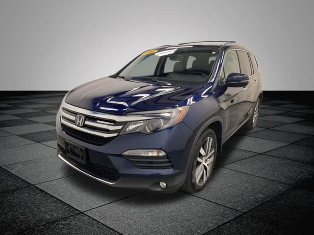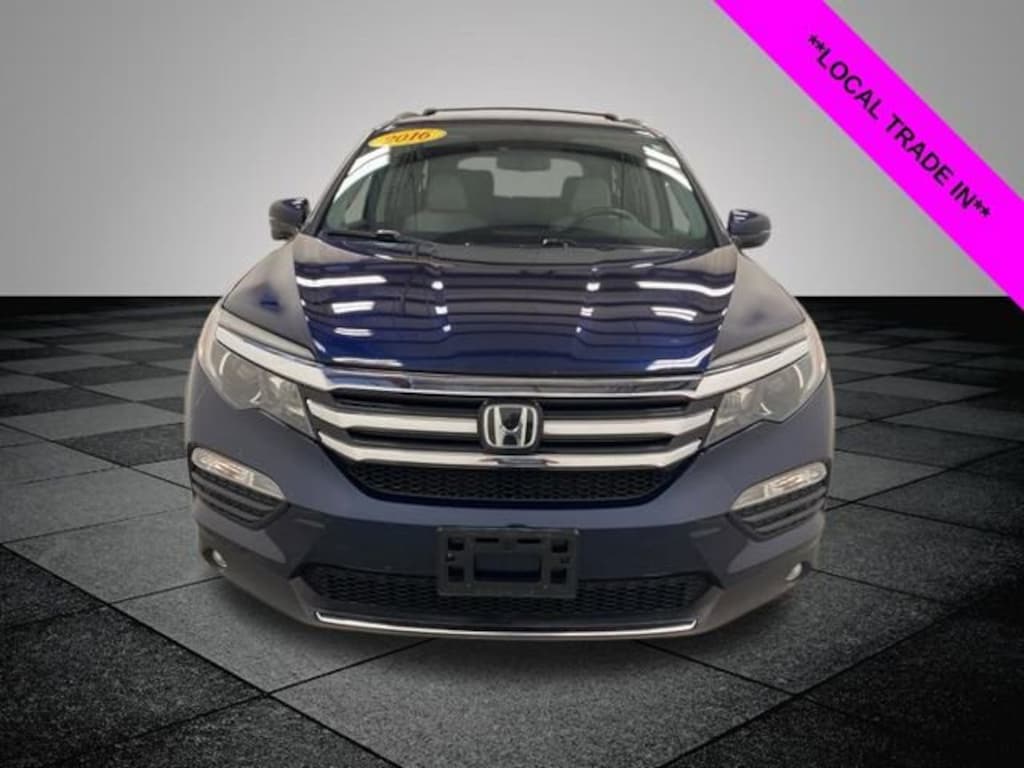 Obsidian Blue Pearl 2016 Honda Pilot Touring AWD 9-Speed Automatic 3.5L V6 24V SOHC i-VTEC **LOCAL TRADE IN**, Pilot Touring, AWD, 10 Speakers, 20" Alloy Wheels, 3rd row seats: split-bench, 4-Wheel Disc Brakes, 4.334 Axle Ratio, A/V remote, ABS brakes, Air Conditioning, Alloy wheels, AM/FM radio: SiriusXM, Auto-dimming Rear-View mirror, Automatic temperature control, Brake assist, Bumpers: body-color, Compass, Delay-off headlights, Driver door bin, Driver vanity mirror, Dual front impact airbags, Dual front side impact airbags, Electronic Stability Control, Emergency communication system: HondaLink Assist, Exterior Parking Camera Rear, Four wheel independent suspension, Front anti-roll bar, Front Bucket Seats, Front Center Armrest, Front dual zone A/C, Front fog lights, Front reading lights, Fully automatic headlights, Garage door transmitter: HomeLink, Headphones, Heated door mirrors, Heated Front Bucket Seats, Heated front seats, Honda Satellite-Linked Navigation System, Illuminated entry, Leather Shift Knob, Leather-Trimmed Seats, Low tire pressure warning, Memory seat, Navigation System, Occupant sensing airbag, Outside temperature display, Overhead airbag, Overhead console, Panic alarm, Passenger door bin, Passenger vanity mirror, Power door mirrors, Power driver seat, Power Liftgate, Power moonroof, Power passenger seat, Power steering, Power windows, Radio data system, Radio: AM/FM Premium Audio System, Rear air conditioning, Rear anti-roll bar, Rear audio controls, Rear reading lights, Rear seat center armrest, Rear window defroster, Rear window wiper, Remote keyless entry, Roof rack: rails only, Security system, SiriusXM Radio, Speed control, Speed-sensing steering, Speed-Sensitive Wipers, Split folding rear seat, Spoiler, Steering wheel mounted audio controls, Tachometer, Telescoping steering wheel, Tilt steering wheel, Traction control, Trip computer, Turn signal indicator mirrors, Variably intermittent wipers, Pilot Touring, AWD.