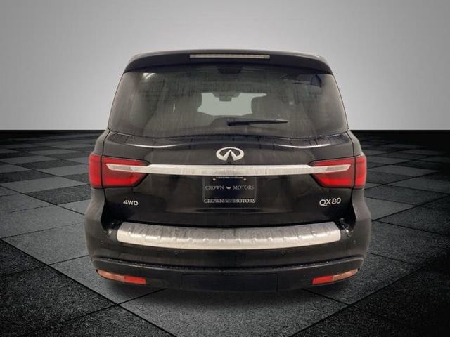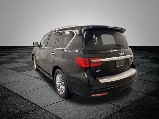 Clean CARFAX. Black Obsidian 2020 INFINITI QX80 LUXE 4WD 7-Speed Automatic 5.6L V8 **ACCIDENT FREE**, **LOCAL TRADE IN**, 4WD, 13 Speakers, 2.937 Axle Ratio, 3rd row seats: split-bench, 4-Wheel Disc Brakes, ABS brakes, Air Conditioning, Alloy wheels, AM/FM radio: SiriusXM, Anti-whiplash front head restraints, Apple CarPlay/Android Auto, Auto High-beam Headlights, Auto tilt-away steering wheel, Auto-dimming door mirrors, Auto-dimming Rear-View mirror, Auto-leveling suspension, Automatic temperature control, Blind Spot Intervention (BSI), Blind Spot Warning, Brake assist, Bumpers: body-color, CD player, Compass, Delay-off headlights, Driver door bin, Driver vanity mirror, Dual front impact airbags, Dual front side impact airbags, DVD-Audio, Electronic Stability Control, Emergency communication system: INFINITI Connection, Four wheel independent suspension, Front anti-roll bar, Front Bucket Seats, Front Center Armrest, Front dual zone A/C, Front fog lights, Front reading lights, Fully automatic headlights, Garage door transmitter: HomeLink, Heated door mirrors, Heated Front Bucket Seats, Heated front seats, Heated steering wheel, Illuminated entry, Intelligent Cruise Control, Lane Departure Prevention (LDP), Leather Shift Knob, Leather steering wheel, Leather-Appointed Seats, Literature Kit, Low tire pressure warning, Memory seat, Navigation system: INFINITI InTouch Navigation, Occupant sensing airbag, Outside temperature display, Overhead airbag, Overhead console, Panic alarm, Passenger door bin, Passenger vanity mirror, Power door mirrors, Power driver seat, Power Liftgate, Power moonroof, Power passenger seat, Power steering, Power windows, ProASSIST Package, Radiant Illuminated Kick Plates, Radio data system, Radio: AM/FM/HD w/Single In-Dash CD Player & MP3, Rain sensing wipers, Rear air conditioning, Rear anti-roll bar, Rear audio controls, Rear reading lights, Rear seat center armrest, Rear window defroster, Rear window wiper, Reclining 3rd row seat, Remote keyless entry, Security system, Smart Rear View Mirror, Speed control, Speed-sensing steering, Split folding rear seat, Spoiler, Steering wheel memory, Steering wheel mounted audio controls, Tachometer, Telescoping steering wheel, Tilt steering wheel, Traction control, Trip computer, Turn signal indicator mirrors, Variably intermittent wipers, Voltmeter, Wheels: 20" x 8.0" Aluminum-Alloy, 4WD.