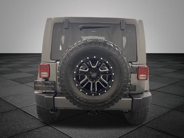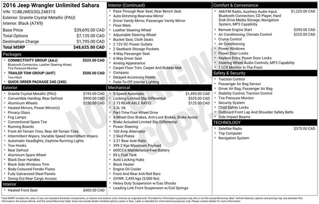 Clean CARFAX. Granite Crystal Metallic Clearcoat 2016 Jeep Wrangler Unlimited Sahara 4WD 5-Speed Automatic 3.6L V6 24V VVT 18" x 7.5" Polished Satin Carbon Wheels, 3.21 Rear Axle Ratio, 4-Wheel Disc Brakes, 8 Speakers, ABS brakes, Air Conditioning, Alloy wheels, AM/FM radio: SiriusXM, Audio Jack Input for Mobile Devices, Auto-dimming Rear-View mirror, Brake assist, CD player, Cloth Seats w/Adjustable Head Restraints, Compass, Driver door bin, Driver vanity mirror, Dual front impact airbags, Electronic Stability Control, Front anti-roll bar, Front Bucket Seats, Front Center Armrest w/Storage, Front fog lights, Front reading lights, Fully automatic headlights, Heated door mirrors, Heavy Duty Suspension w/Gas Shocks, Illuminated entry, Integrated roll-over protection, Leather steering wheel, Leather Wrapped Steering Wheel, Low tire pressure warning, Occupant sensing airbag, Outside temperature display, Panic alarm, Passenger door bin, Passenger vanity mirror, Power door mirrors, Power steering, Power windows, Radio data system, Radio: 130, Rear anti-roll bar, Remote keyless entry, Security system, Speed control, Split folding rear seat, Steering wheel mounted audio controls, Sunrider Soft Top, Tachometer, Tilt steering wheel, Traction control, Trip computer, Variably intermittent wipers.