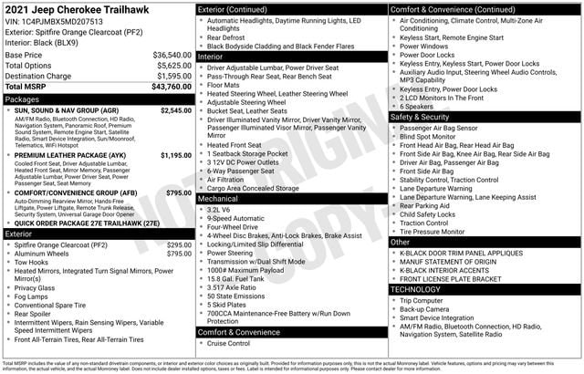 CARFAX One-Owner. Spitfire Orange Clearcoat 2021 Jeep Cherokee Trailhawk 4WD 9-Speed Automatic 3.2L V6 1-Year SiriusXM Guardian Trial, 4G LTE Wi-Fi Hot Spot, 5-Year SiriusXM Traffic Service, 5-Year SiriusXM Travel Link Service, Auto-Dimming Rear-View Mirror, Comfort/Convenience Group, Exterior Mirrors w/Memory, For Details Visit DriveUconnect.com, GPS Navigation, Hands-Free Power Liftgate, HD Radio, Off-Road Info Pages, Power Driver/Passenger 4-Way Lumbar Adjust, Power Front Driver/Passenger Seats, Power Front/Fixed Rear Full Sunroof, Premium Alpine Speaker System, Premium Leather Package, Premium Leather Trimmed Bucket Seats, Quick Order Package 27E Trailhawk, Radio: Uconnect 4C Nav w/8.4" Display, Radio/Driver Seat/Exterior Mirrors Memory, Security Alarm, SiriusXM Traffic Plus, SiriusXM Travel Link, Sun, Sound & Nav Group, Universal Garage Door Opener, Ventilated Front Seats, 3.517 Axle Ratio, 4-Wheel Disc Brakes, 6 Speakers, ABS brakes, Air Conditioning, Alloy wheels, AM/FM radio: SiriusXM, Anti-whiplash front head restraints, Apple CarPlay/Android Auto, Automatic temperature control, AutoStick Automatic Transmission, Auxiliary Transmission Oil Cooler, Brake assist, Cloth/Premium Vinyl Bucket Seats, Compass, Delay-off headlights, Driver door bin, Driver vanity mirror, Dual front impact airbags, Dual front side impact airbags, Electronic Stability Control, Four wheel independent suspension, Front anti-roll bar, Front Bucket Seats, Front Center Armrest, Front dual zone A/C, Front fog lights, Front License Plate Bracket, Front reading lights, Fully automatic headlights, Heated door mirrors, Heated front seats, Heated steering wheel, Hill Descent Control, Illuminated entry, K-Black Door Trim Panel Appliques, K-Black Interior Accents, Knee airbag, Leather Shift Knob, Low tire pressure warning, Manuf Statement of Origin, Occupant sensing airbag, Off Road Suspension, Outside temperature display, Overhead airbag, Overhead console, Panic alarm, ParkView Rear Back-Up Camera, Passenger door bin, Passenger vanity mirror, Power door mirrors, Power driver seat, Power steering, Power windows, Radio data system, Radio: Uconnect 4 w/8.4" Display, Rain sensing wipers, Rear anti-roll bar, Rear reading lights, Rear seat center armrest, Rear side impact airbag, Rear window defroster, Rear window wiper, Remote keyless entry, Speed control, Speed-sensing steering, Split folding rear seat, Spoiler, Steering wheel mounted audio controls, Tachometer, Telescoping steering wheel, Tilt steering wheel, Traction control, Trip computer, Turn signal indicator mirrors, Variably intermittent wipers, Voltmeter, Wheels: 17" x 7.5" Black Painted Aluminum, Wheels: 17" x 7.5" Painted Diamond Cut Aluminum, **Bluetooth**, **Leather**, **Rear Back Up Camera**, 1-Year SiriusXM Guardian Trial, 4G LTE Wi-Fi Hot Spot, 5-Year SiriusXM Traffic Service, 5-Year SiriusXM Travel Link Service, Auto-Dimming Rear-View Mirror, Comfort/Convenience Group, Exterior Mirrors w/Memory, For Details Visit DriveUconnect.com, GPS Navigation, Hands-Free Power Liftgate, HD Radio, Off-Road Info Pages, Power Driver/Passenger 4-Way Lumbar Adjust, Power Front Driver/Passenger Seats, Power Front/Fixed Rear Full Sunroof, Premium Alpine Speaker System, Premium Leather Package, Premium Leather Trimmed Bucket Seats, Quick Order Package 27E Trailhawk, Radio: Uconnect 4C Nav w/8.4" Display, Radio/Driver Seat/Exterior Mirrors Memory, Security Alarm, SiriusXM Traffic Plus, SiriusXM Travel Link, Sun, Sound & Nav Group, Universal Garage Door Opener, Ventilated Front Seats.