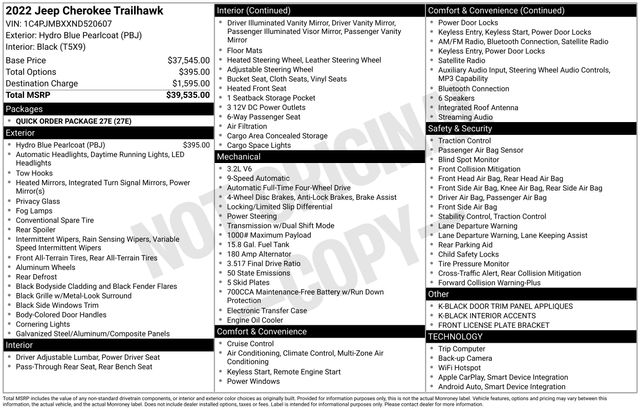 Whether you're tackling the great outdoors or simply commuting in style, the 2022 Jeep Cherokee Trailhawk is the perfect choice. Experience the perfect blend of capability, comfort, and technology â" visit our showroom today and let us put you behind the wheel.