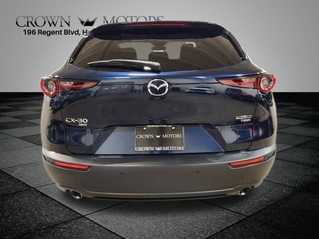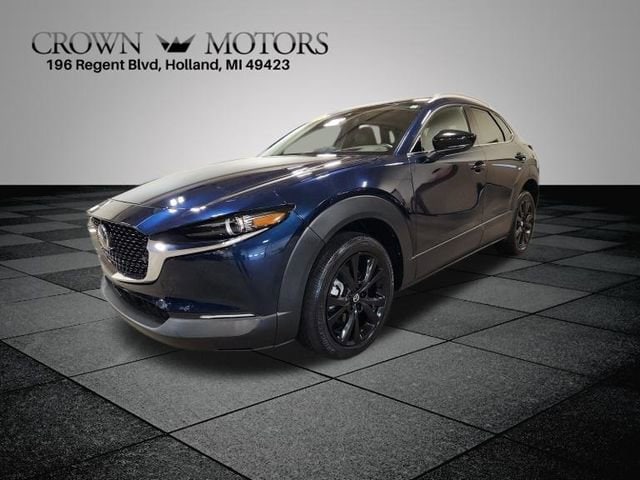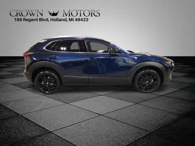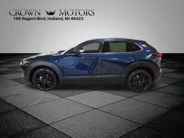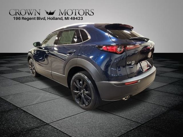 CARFAX One-Owner. Deep Crystal Blue Mica 2022 Mazda CX-30 2.5 Turbo Premium Plus Package w/Premium Plus Package AWD 6-Speed Automatic 2.5L I4 **ONE OWNER**, ** LOW MILES**, 12 Speakers, 3.841 Axle Ratio, 4-Wheel Disc Brakes, ABS brakes, Air Conditioning, Alloy wheels, AM/FM radio: SiriusXM, AppLink/Apple CarPlay and Android Auto, Auto High-beam Headlights, Auto-dimming door mirrors, Auto-dimming Rear-View mirror, Automatic temperature control, Black Lug Nuts & Black Wheel Locks, Brake assist, Bumpers: body-color, Cargo Mat, Compass, Delay-off headlights, Driver door bin, Driver vanity mirror, Dual front impact airbags, Dual front side impact airbags, Electronic Stability Control, Emergency communication system: Mazda Connected Services (Automatic 911 Dialing), Front anti-roll bar, Front Bucket Seats, Front Center Armrest, Front dual zone A/C, Front reading lights, Front wheel independent suspension, Fully automatic headlights, Garage door transmitter: HomeLink, Heads-Up Display, Heated door mirrors, Heated Front Bucket Seats, Heated front seats, Heated steering wheel, Illuminated entry, Knee airbag, Leather Seat Trim, Leather Shift Knob, Leather steering wheel, Low tire pressure warning, MAZDA CONNECT Infotainment System, Memory seat, Navigation system: MAZDA CONNECT, Occupant sensing airbag, Outside temperature display, Overhead airbag, Overhead console, Panic alarm, Passenger door bin, Passenger vanity mirror, Power door mirrors, Power driver seat, Power Liftgate, Power moonroof, Power steering, Power windows, Radio data system, Radio: AM/FM/HD Audio System w/Mazda Navigation, Rain sensing wipers, Rear seat center armrest, Rear window defroster, Rear window wiper, Remote keyless entry, Roof rack: rails only, Speed control, Speed-sensing steering, Split folding rear seat, Spoiler, Steering wheel mounted audio controls, Tachometer, Telescoping steering wheel, Tilt steering wheel, Traction control, Trip computer, Turn signal indicator mirrors, Variably intermittent wipers, Wheels: 18" x 7J Black Aluminum Alloy.