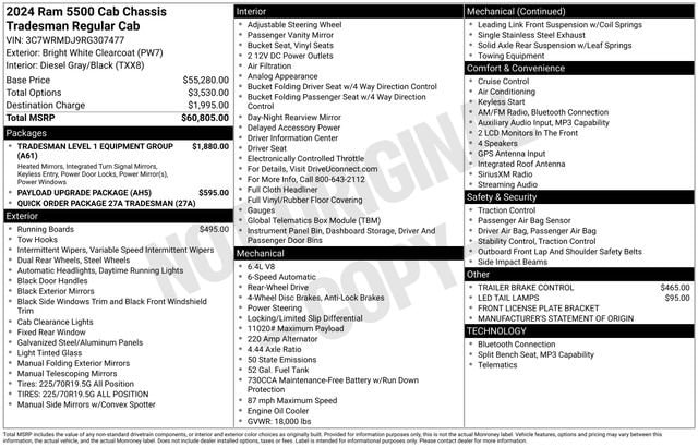 Clean CARFAX.16ft BAY BRIDGE BOX TRUCK - White 2024 Ram 5500HD Tradesman RWD Aisin 6-Speed Automatic 6.4L V8 19.5" x 6.0" Steel Wheels, 4 Speakers, 4-Wheel Disc Brakes, 87 mph Maximum Speed, ABS brakes, Air Conditioning, Black Exterior Mirrors, Compass, Delay-off headlights, Driver door bin, Dual front impact airbags, Dual rear wheels, Electronic Stability Control, Electronically Controlled Throttle, Emergency communication system: SiriusXM Guardian, For Details, Visit DriveUconnect.com, For More Info, Call 800-643-2112, Front anti-roll bar, Front Bucket Seats, Fully automatic headlights, Global Telematics Box Module (TBM), GPS Antenna Input, HD Vinyl 40/20/40 Split Bench Seat, Integrated Voice Command w/Bluetooth, Manual Adjust 4-Way Driver Seat, Manual Adjust 4-Way Front Passenger Seat, Manual Folding Exterior Mirrors, Manual Telescoping Mirrors, Occupant sensing airbag, Outside temperature display, Passenger door bin, Passenger vanity mirror, Power steering, Radio data system, Radio: Uconnect 3 w/5" Display, Rear anti-roll bar, SiriusXM Radio Service, Speed control, Tachometer, Temperature & Compass Gauge, Tilt steering wheel, Traction control, Variably intermittent wipers, Voltmeter.