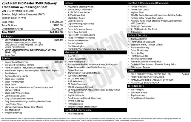 White 2024 Ram ProMaster 3500 Cutaway Box Truck FWD 9-Speed 948TE Automatic 3.6L V6 24V VVT ABS brakes, Electronic Stability Control, Illuminated entry, Low tire pressure warning, Remote keyless entry, Traction control.