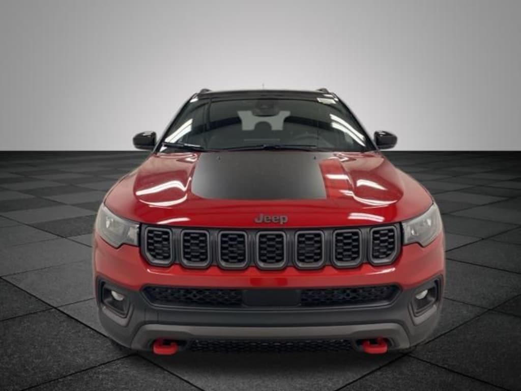 Clean CARFAX. Red 2026 Jeep Compass Trailhawk 4WD 8-Speed Automatic 2.0L I4 DOHC 4WD, Quick Order Package 29E, 10.1" Touchscreen Display, 4-Wheel Disc Brakes, 4.398 Final Drive Ratio, 6 Speakers, ABS brakes, Air Conditioning, Alloy wheels, AM/FM radio: SiriusXM, Auto High-beam Headlights, Auto-dimming Rear-View mirror, Automatic temperature control, Brake assist, Bumpers: body-color, Compass, Delay-off headlights, Driver door bin, Driver vanity mirror, Dual front impact airbags, Dual front side impact airbags, Electronic Stability Control, Four wheel independent suspension, Front anti-roll bar, Front Bucket Seats, Front Center Armrest w/Storage, Front dual zone A/C, Front fog lights, Front reading lights, Fully automatic headlights, Heated door mirrors, Heated front seats, Heated steering wheel, Illuminated entry, Knee airbag, Leather Shift Knob, Leather steering wheel, Low tire pressure warning, Occupant sensing airbag, Outside temperature display, Overhead airbag, Overhead console, Panic alarm, ParkView Rear Back-Up Camera, Passenger door bin, Passenger vanity mirror, Power door mirrors, Power driver seat, Power Liftgate, Power steering, Power windows, Premium Cloth/Leather Trim Bucket Seats, Rain sensing wipers, Rear anti-roll bar, Rear seat center armrest, Rear window defroster, Rear window wiper, Remote keyless entry, Security system, Speed control, Split folding rear seat, Spoiler, Steering wheel mounted audio controls, Tachometer, Telescoping steering wheel, Tilt steering wheel, Traction control, Trip computer, Turn signal indicator mirrors, Variably intermittent wipers, Wheels: 17" x 6.5" Painted Black Aluminum, **Bluetooth**, **Rear Back Up Camera**, 4WD, Quick Order Package 29E.